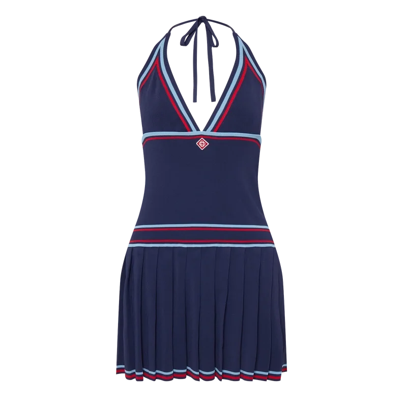 Completado com detalhes de riscas vermelhas e brancas contrastantes no corpete e na bainha, um decote em V profundo, fecho com cordões e um painel plissado.