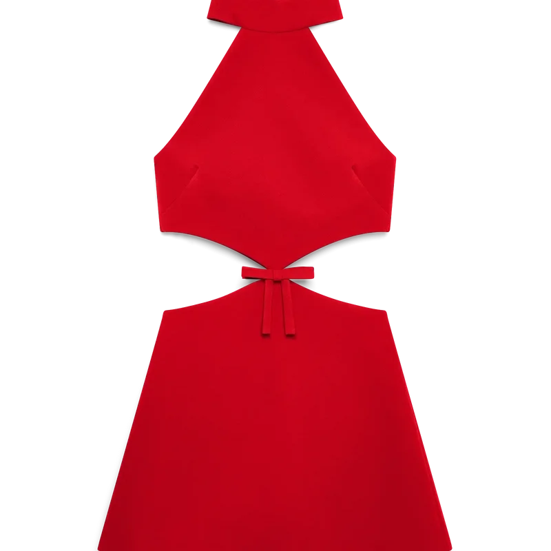 O vestido com recortes é um modelo mini sem mangas, em linha A, com recortes nas laterais. Apresenta fecho de correr, decote halter com gola em banda e detalhe de laço na cintura, onde o tecido se estreita.