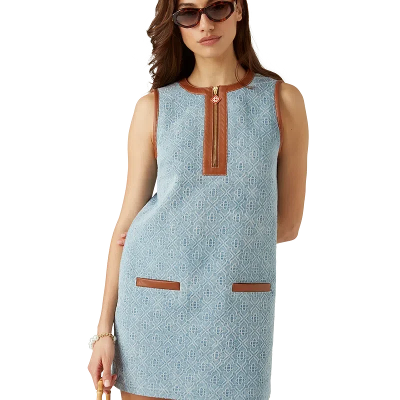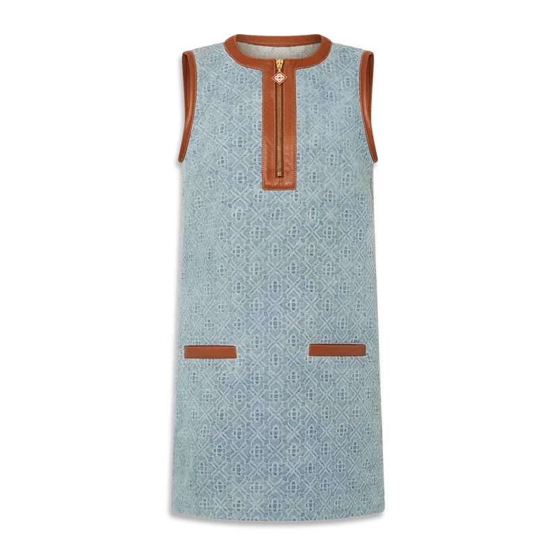 O vestido de ganga com monograma é um modelo mini sem mangas, de corte reto, confeccionado em tecido de ganga de mistura de algodão. Apresenta fecho de correr frontal até ao meio com a aba de fecho Monogram característica, bolsos de debrum frontais, gola redonda, cavas, pescoço, bolsos e carcela, todos com acabamentos em pele Nappa – Concebido para um corte clássico.
