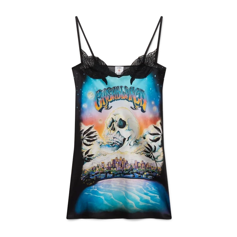 O vestido de renda La Pramonition é um modelo mini confeccionado em tecido de slip estampado e apresenta uma ilustração sazonal de uma visão misteriosa do horizonte de La à noite, com elementos OVNI que remetem a uma inspiração vintage de ficção científica. Completado com alças finas e detalhes em renda.
