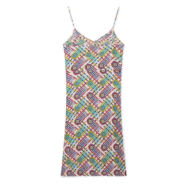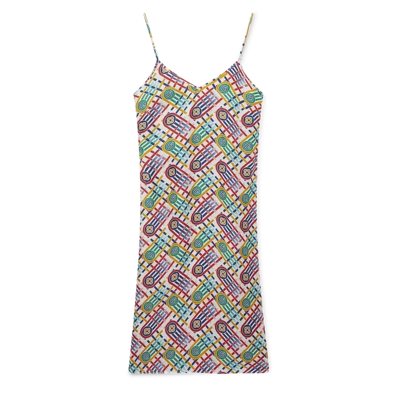 O vestido justo de seda com Monograma Tennis apresenta a arte emblemática da Maison reinterpretada para a coleção cápsula exclusiva da Nordstrom, centrada no estilo «athleisure» moderno inspirado no ténis.