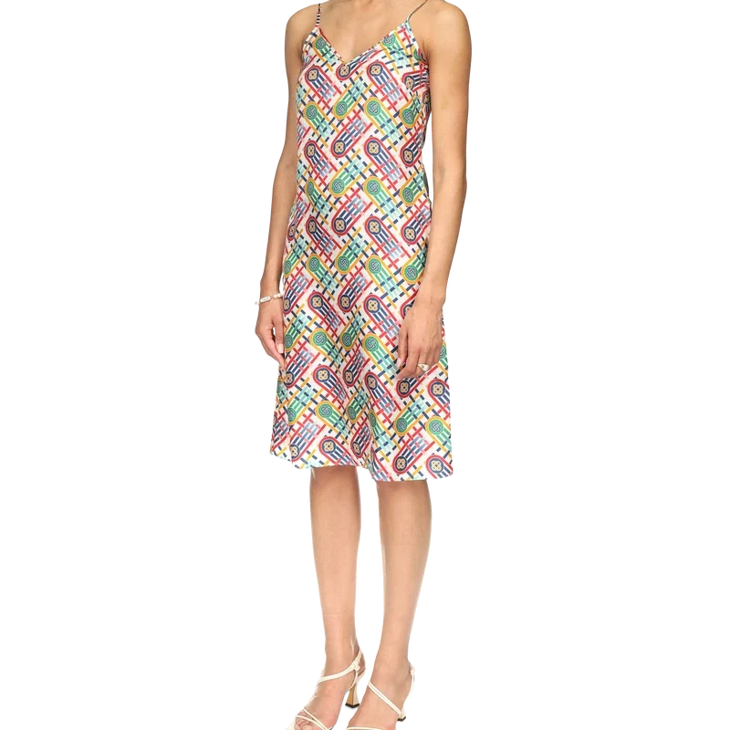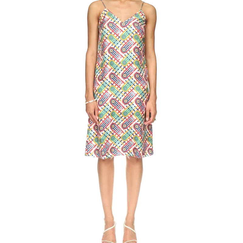 Acabamento com alças finas e decote em V suave, ligeiramente evasê na saia de comprimento médio.
