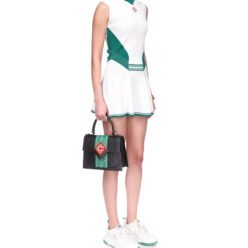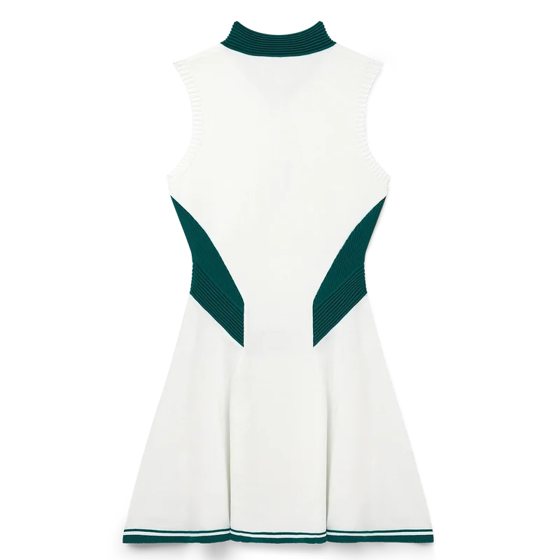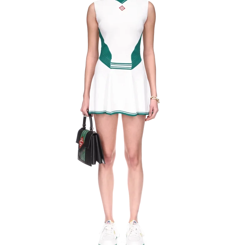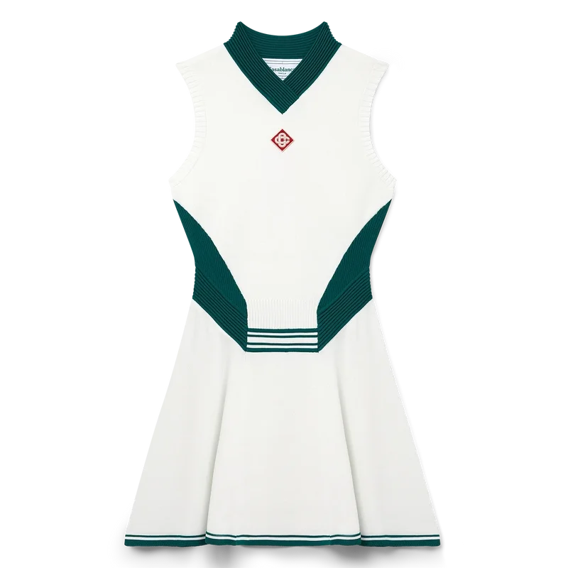O vestido de ténis drapeado é um modelo sem mangas com um decote em V profundo, inspirado no ténis e confeccionado num tecido de malha com o logótipo de diamante emblemático da marca no peito. Apresenta um corpete justo, uma cintura descaída, uma saia com painéis e detalhes contrastantes na bainha, bem como detalhes em canelado contrastante na gola, nos painéis laterais e na cintura.