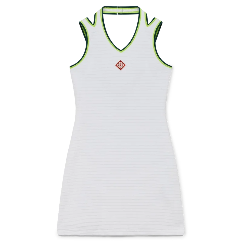 O vestido de ténis em veludo texturado é um modelo mini em linha A, confeccionado em tecido de veludo. Apresenta um decote halter em V, alças nos ombros com um decote profundo nas costas e o logótipo de diamante característico da marca no peito.