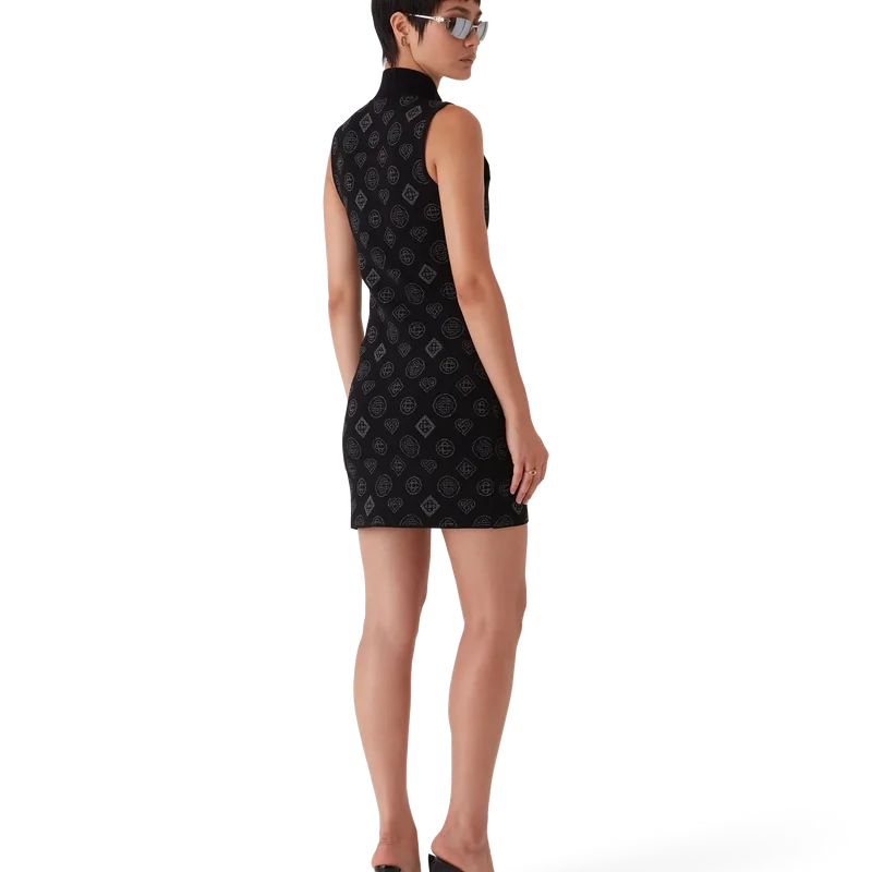 O vestido em jacquard Monogram é um modelo mini sem mangas, de corte em A, confeccionado num tecido de mistura de poliéster com o logótipo Honeydrew da marca repetido num subtil padrão preto sobre preto. Apresenta fecho de correr frontal com a aba do fecho com o logótipo de diamante característico da marca, gola de banda e bolsos com aba.