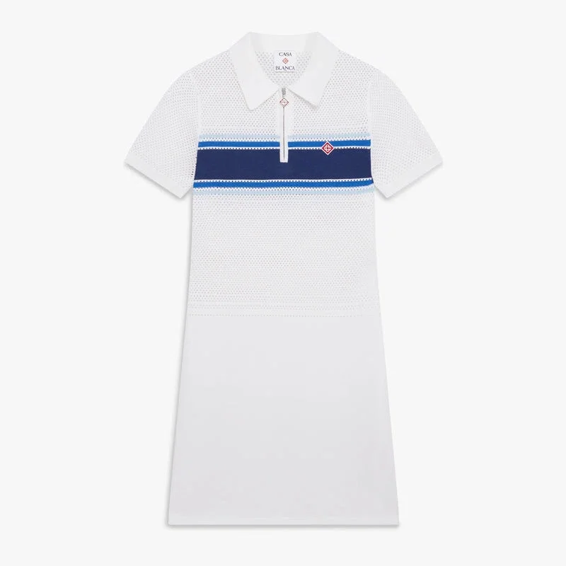 O vestido midi em malha com riscas brancas e azuis apresenta um design de malha requintado, com uma risca azul no peito e nas costas, e uma elegante construção em jacquard com riscas em malha. Completo com uma gola clássica, fecho de correr, o logótipo de diamante característico da marca, mangas curtas com punhos canelados e uma silhueta midi descontraída.