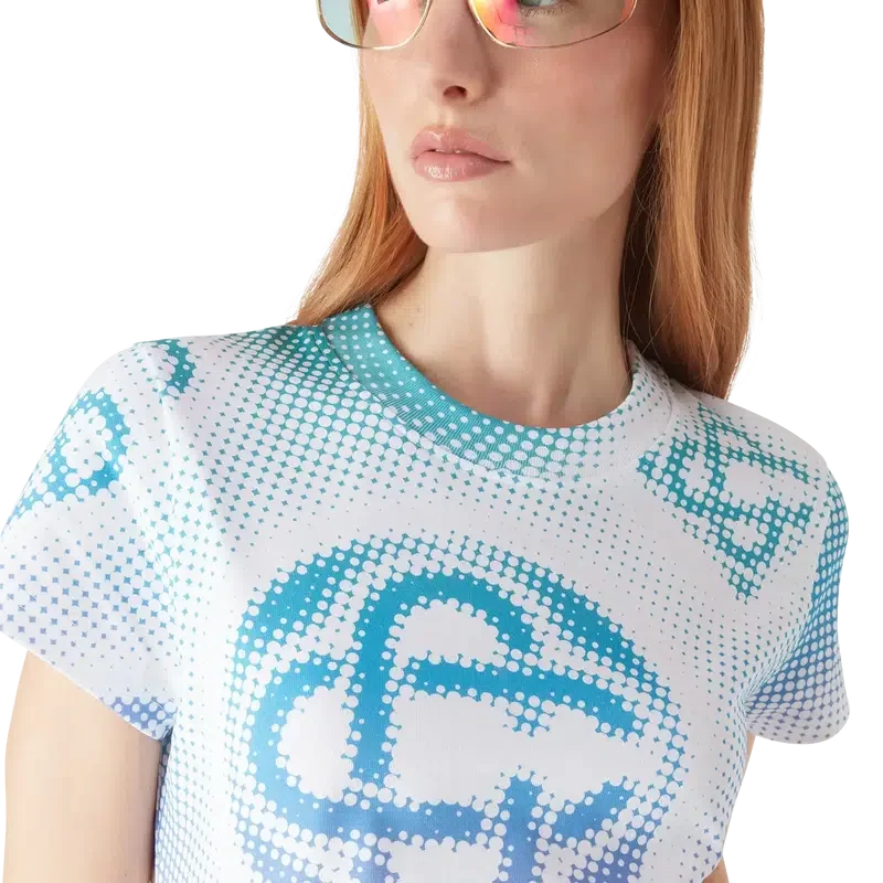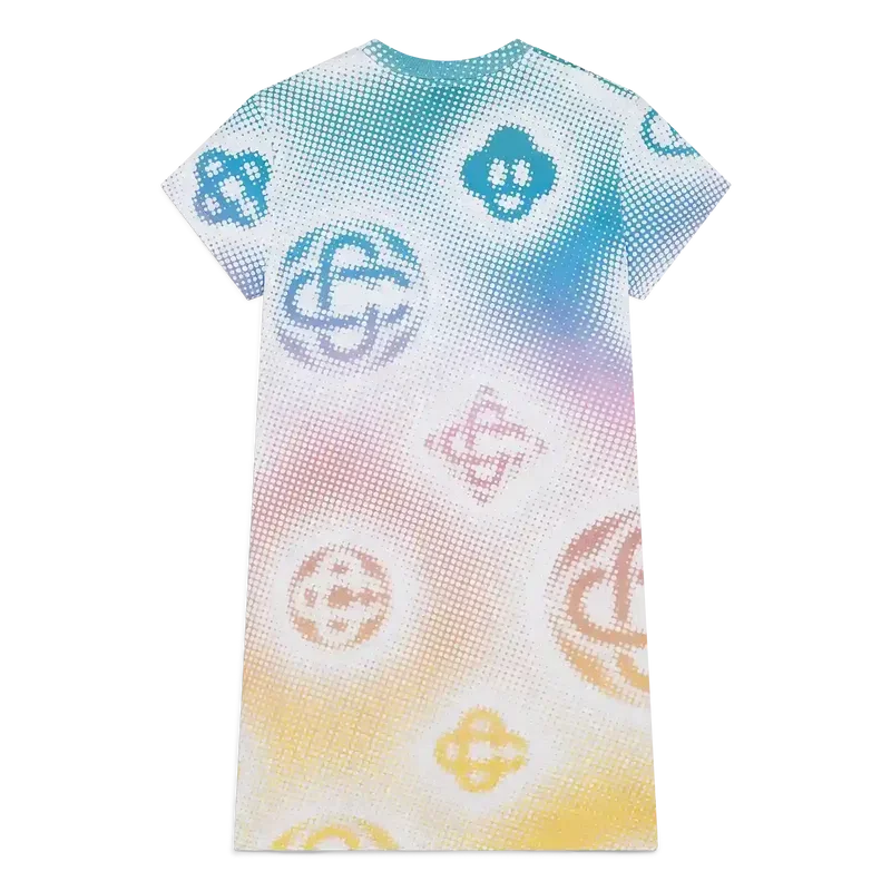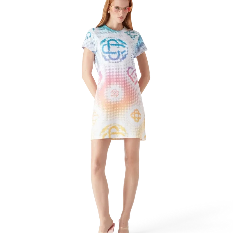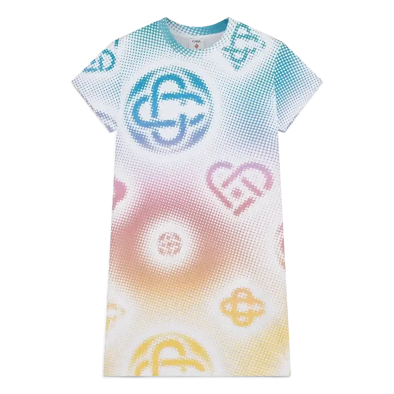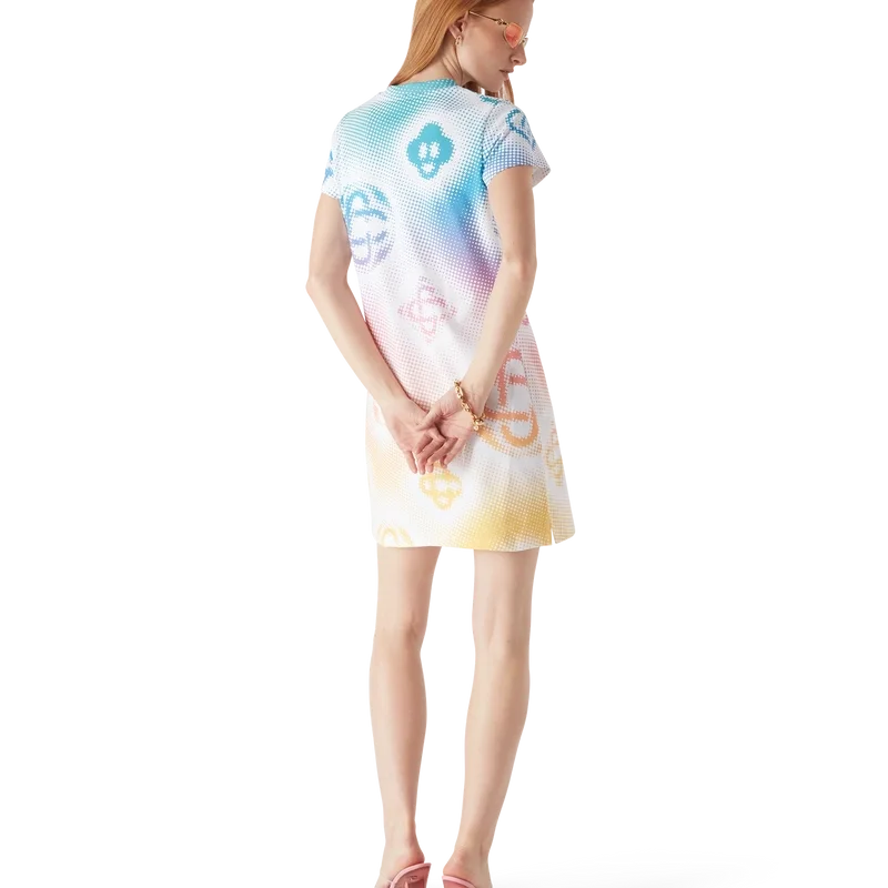 O vestido-camisola em meio-tom é um modelo de manga curta confeccionado em tecido de algodão estampado com a arte dos monogramas da marca, utilizando aerografia, baseando-se nas nossas experiências anteriores com a técnica, e completado com um clássico decote redondo e uma silhueta descontraída.